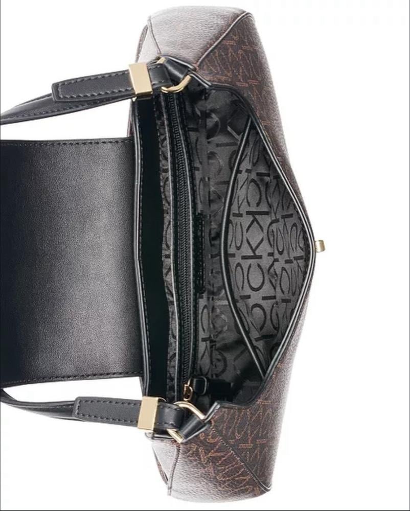 - اللون والتصميم: تأتي الحقيبة بلون بني غني مع نمط مكرر لعلامة CK، مما يضيف لمسة من الفخامة.